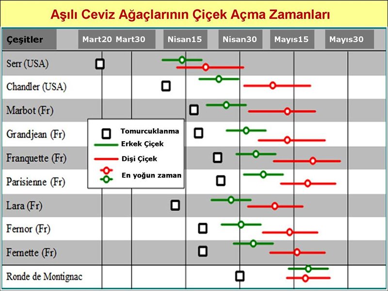 İlkbahar geç donlarına maruz kalmamak için; Ceviz bahçesi kuracağınız bölgenin yıllık hava koşulları ile aşağıdaki tabloyu karşılaştırmalısınız ve uygun fidanı tespit ederek ağaçlandırma yapmaya özen göstermelisiniz